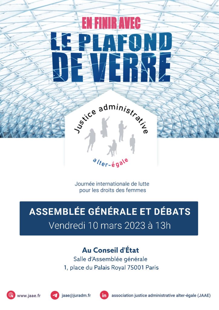 A l’occasion de la journée internationale de lutte pour les droits des femmes et de la journée internationale des femmes juges, Justice administrative alter-égale a organisé le vendredi 10 mars 2023 au Conseil d’État son assemblée générale annuelle, suivie d’une après-midi de débats ouverts à toutes et tous sur le thème « En finir avec le plafond de verre ».