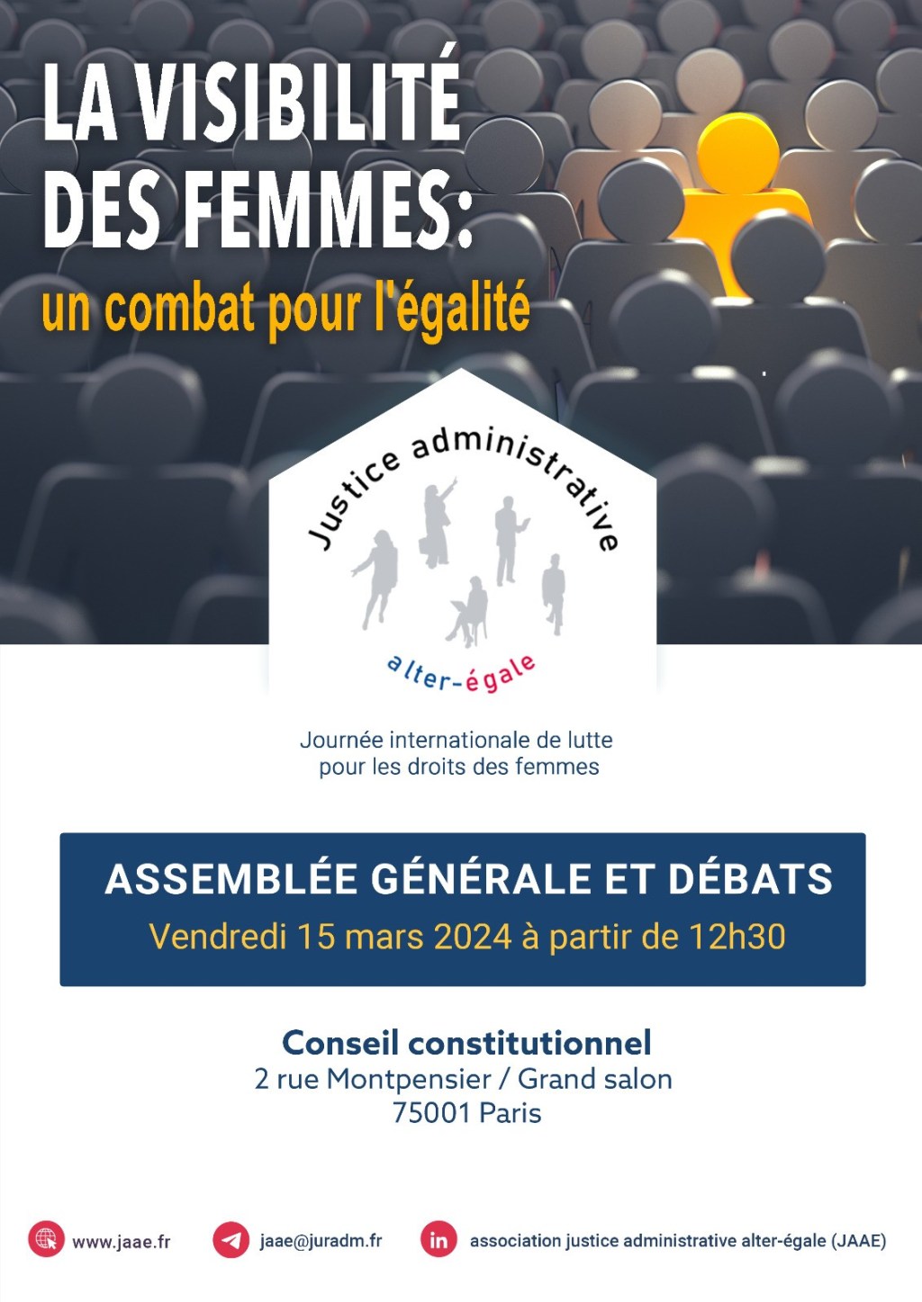 A l’occasion de la journée internationale de lutte pour les droits des femmes, l’association Justice administrative alter-égale a organisé, le vendredi 15 mars 2024 au Conseil constitutionnel, son assemblée générale suivie de son après-midi de débats annuelle !